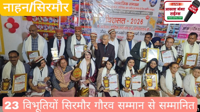 साहित्यिक, सांस्कृतिक व रंगमंच और समाज सेवा के क्षेत्र में पिछले 11 वर्षों से उत्कृष्ट कार्य करने वाली सामाजिक संस्था शंखनाद सामाजिक संगठन विगत वर्षों की भांति इस वर्ष भी नाहन में एक राज्यस्तरीय साहित्यिक सांस्कृतिक और सम्मान समारोह ” विरासत -2026 का आयोजन किया। जिसमें समाज में अलग अलग क्षेत्रों में प्रशंसनीय कार्य करने वालों को सिरमौर गौरव सम्मान 2026 प्रदान किया गया।