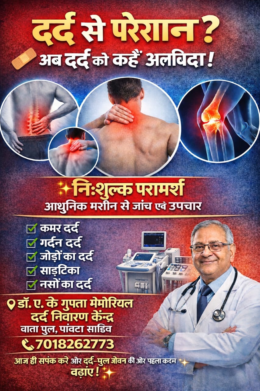 जिला सिरमौर के उपमंडल पांवटा साहिब के बातापुल चौक के समीप स्थित Dr. A.K.Gupta मेमोरियल चैरिटेबल हेल्थकेयर सेंटर शहर में तेजी से बढ़ रही हड्डी, जोड़ और नसों से जुड़ी समस्याओं से राहत दिलाने हेतु आम जनता के लिए उम्मीद की नई किरण बनकर उभरा है। केंद्र द्वारा अत्याधुनिक मशीनों और वैज्ञानिक पद्धतियों के माध्यम से संपूर्ण शरीर की जांच और प्रभावी उपचार की सुविधा उपलब्ध कराई जा रही है।
